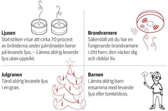 • Gör det till en del av jultraditionen att särskilt kontrollera dina brandvarnare. Om brandvarnaren inte ger ifrån sig en signal – byt batteri. Hjälper inte batteribytet – byt ut brandvarnaren.